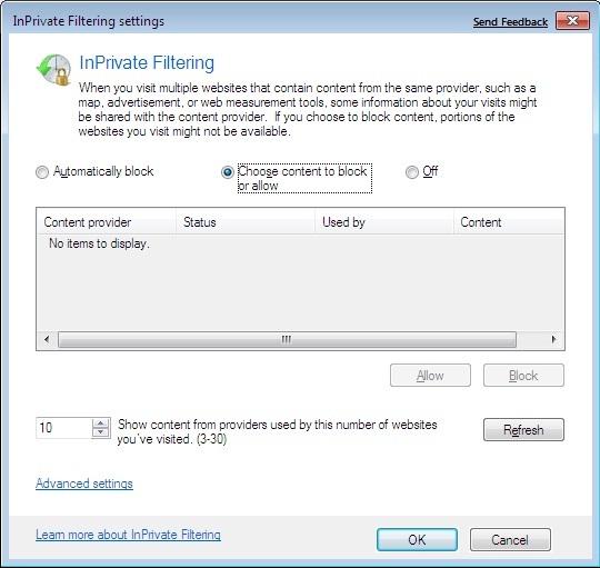وللوصول إلى خصائص ميزة مراقبة المصادر الخارجية قم بإختيار "خصائص مراقبة المصادر الخارجية Inprivate Filtering" من قائمة الحماية :