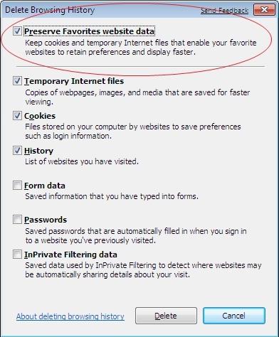 قامت مايكروسوفت بإضافة اختيار يسمح لمستعرض الويب بالإبقاء على ملفات الإنترنت الإحتياطية وملفات المواقع الإليكترونية المخزنة على أجهزة المستخدمين “Cookies” وذلك عند قيامهم بحذف المواقع الإليكترونية التي تمت زيارتها – مما يساعد على حماية معلومات المستخدمين وخصوصياتهم عند إختيار المواقع الموثوقة على قائمة المفضلات.
